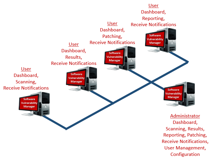 Software Vulnerability Manager uses role-based account management. Each Software Vulnerability Manager user is created and assigned a set of roles and limitations as appropriate. These roles determine which parts of Software Vulnerability Manager the user has access to and limits what the user can view and scan.