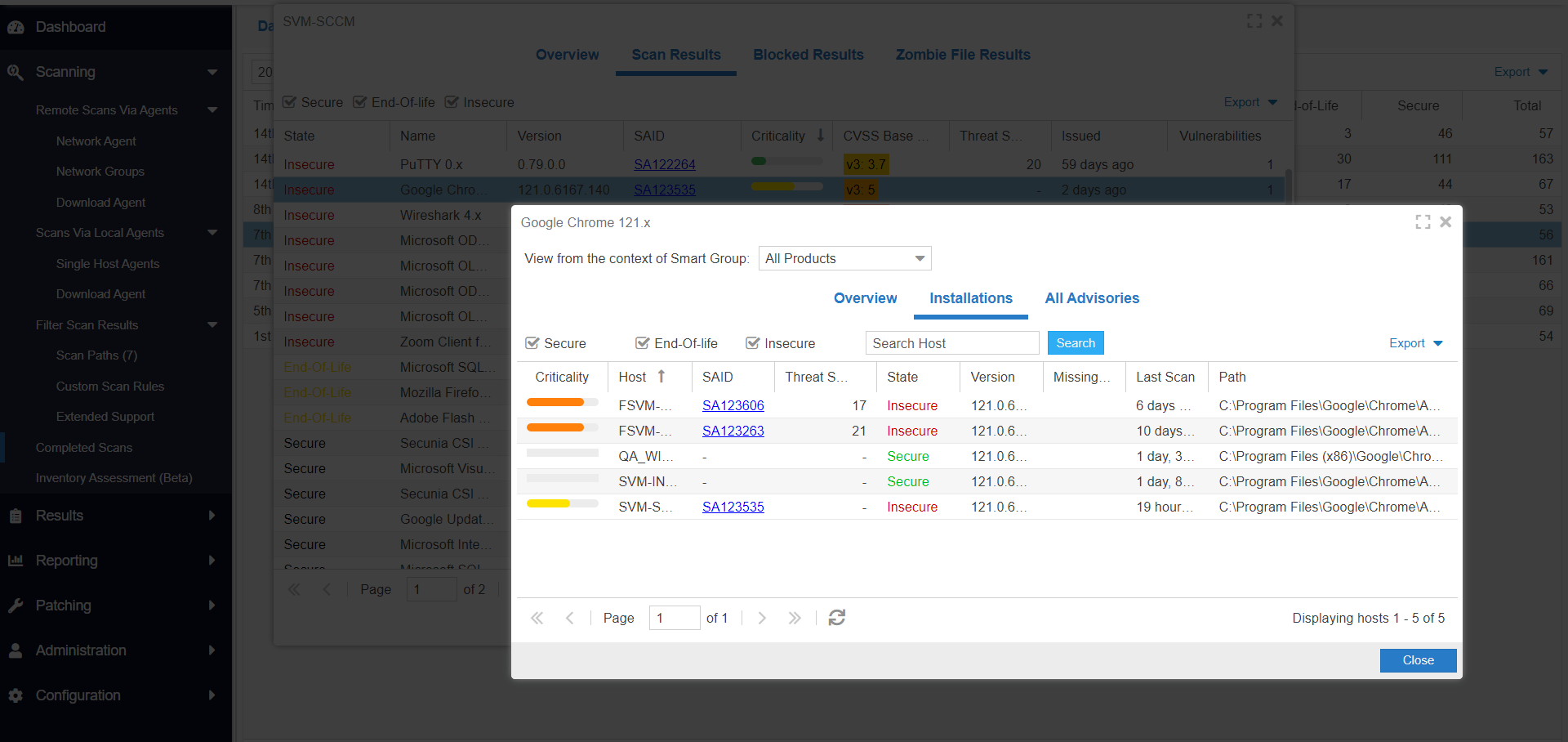 When the user double clicks the product and selects the Installations tab, all the installations of that product get appear along with their Threat Score.