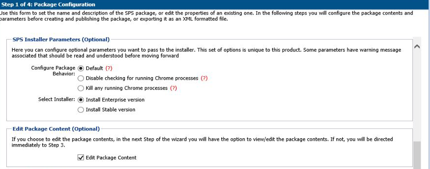 In Step 1 of 4 of the SPS wizard (Package Configuration), select the appropriate SPS Installer Parameters and choose whether you want to edit the package contents. Click Next when done.