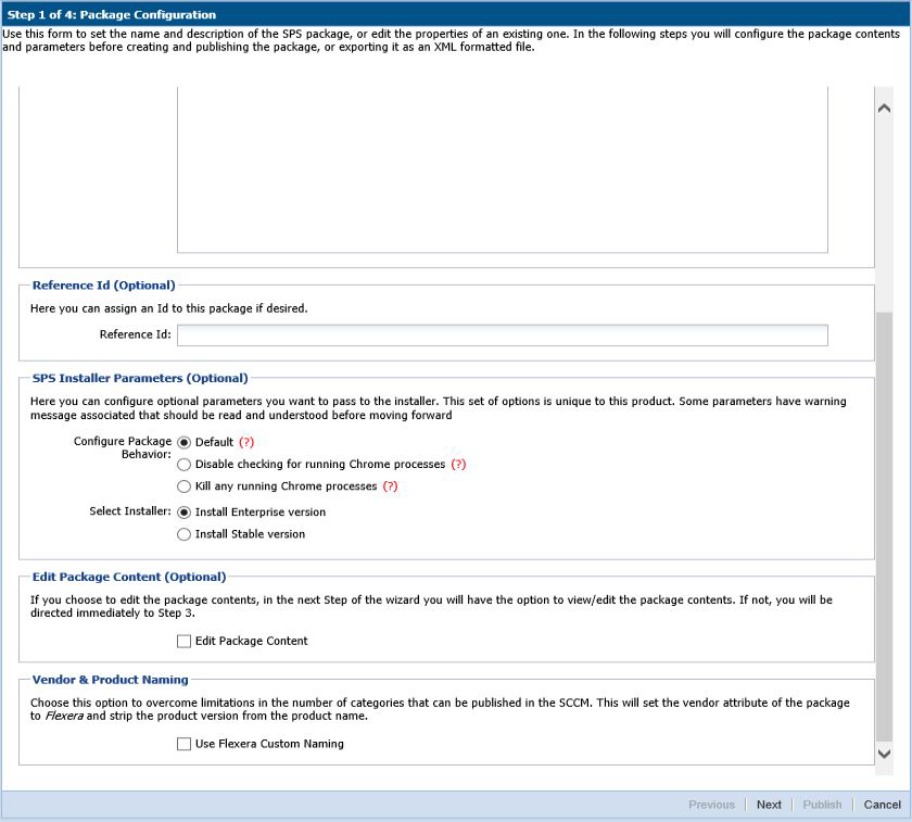 Step 1 of 4 of the Flexera SPS wizard will open with the SPS parameters prefilled. From the same SPS wizard, you can either publish the package to various channels or you can save only the template.