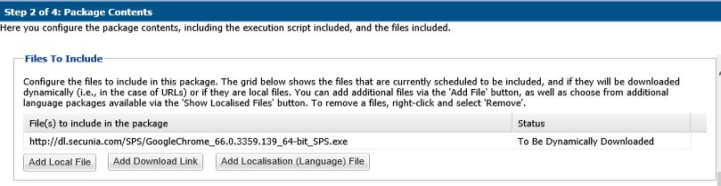 Step 2 of 4 of the SPS wizard (Package Contents) lists the latest files to include in the package. Click Next.