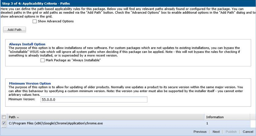 In Step 3 of 4 of the SPS wizard (Applicability Criteria - Paths), select the appropriate paths to save the package. Click Next.