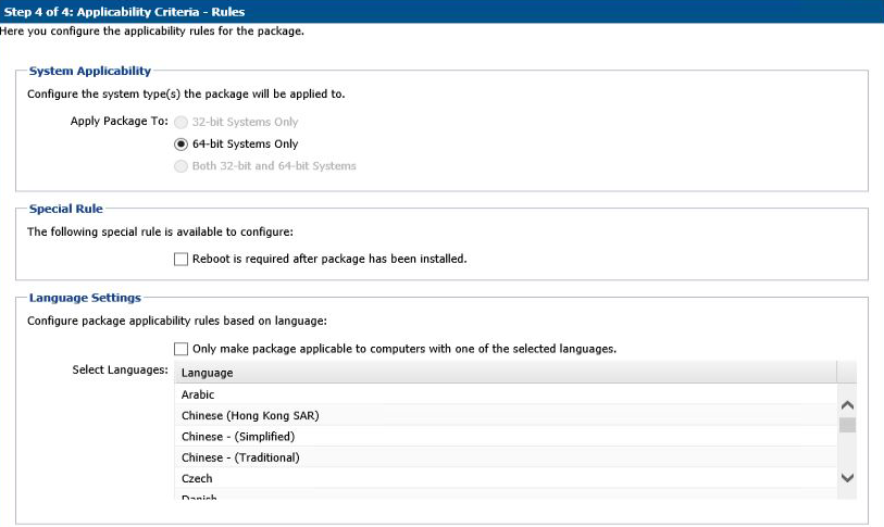 In Step 4 of 4 of the SPS wizard (Applicability Criteria - Rules), select the appropriate System Applicability, Special Rules, and Language Settings.