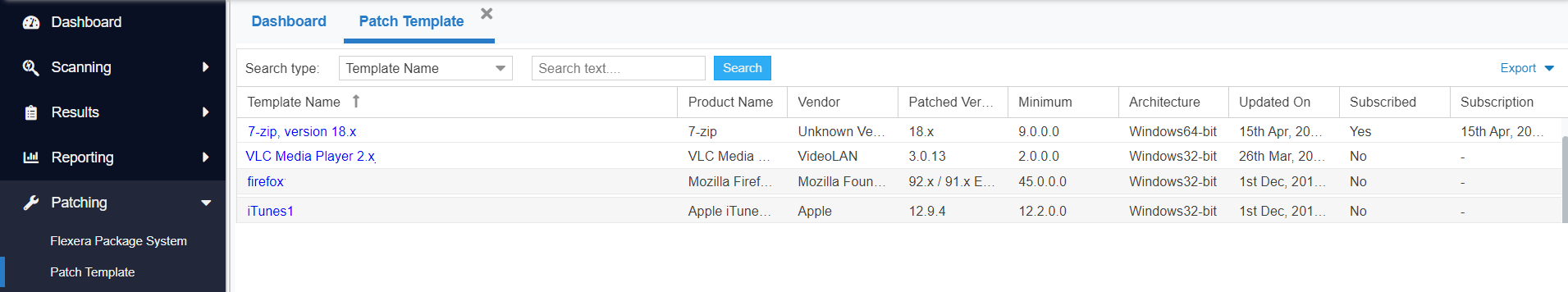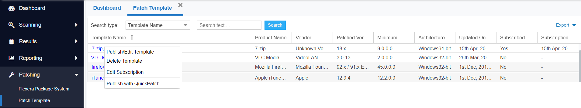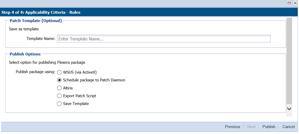 The Software Vulnerability Manager Patching tab includes a Patch Template feature so that users can save a template of their patches for a product. With the Patch Template feature, the user can prepopulate Flexera’s Software Package System (SPS) four-step deployment process and publish directly to WSUS using previously selected options.