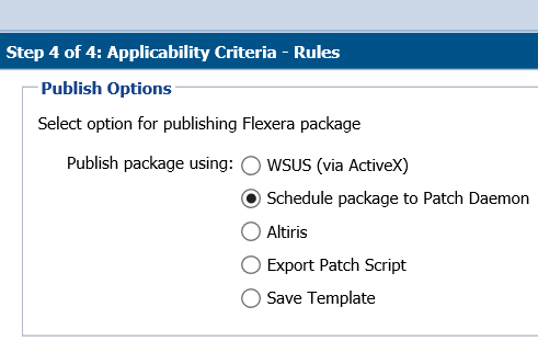 In Step 4 of 4 of the SPS wizard (Applicability Criteria - Rules), select WSUS for the publishing option and click Publish.