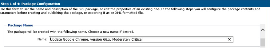 When Step 1 of 4 of the SPS wizard (Package Configuration) appears, update the Package Name to indicate this package is for WSUS publishing and click Next.