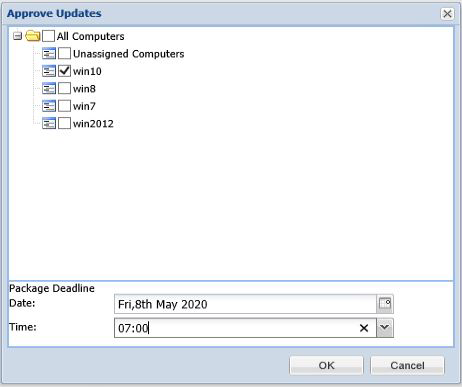 When the Approve Updates pop-up window appears, select the appropriate computers to deploy the WSUS package to, select the appropriate date and time to deploy the WSUS package, and click OK.