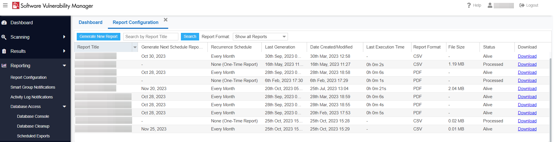You can configure a new report by clicking Generate New Report or right-click an existing report to view, edit or delete it. For more information, see Generate a New Report. The Software Vulnerability Manager reporting capabilities allow the user to schedule and fully customize the intended report.