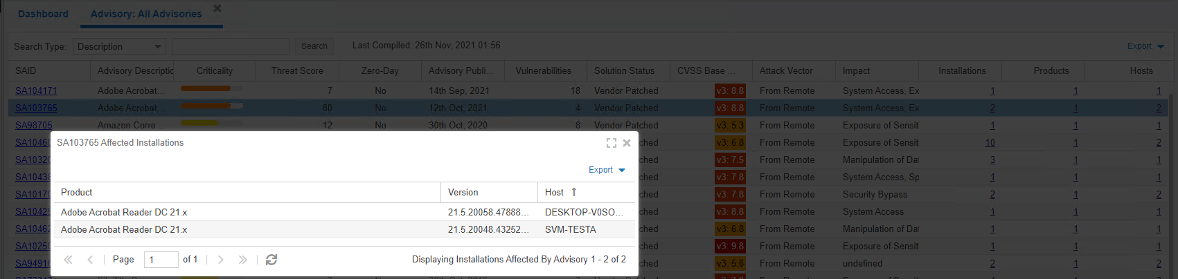 Under the Configured Advisory Group view is a listing of All Advisories. For each advisory, you can click the corresponding number listed in the Installations, Products, and Hosts columns. After clicking the number in the Installations column, you will see a list of affected installations per host.
